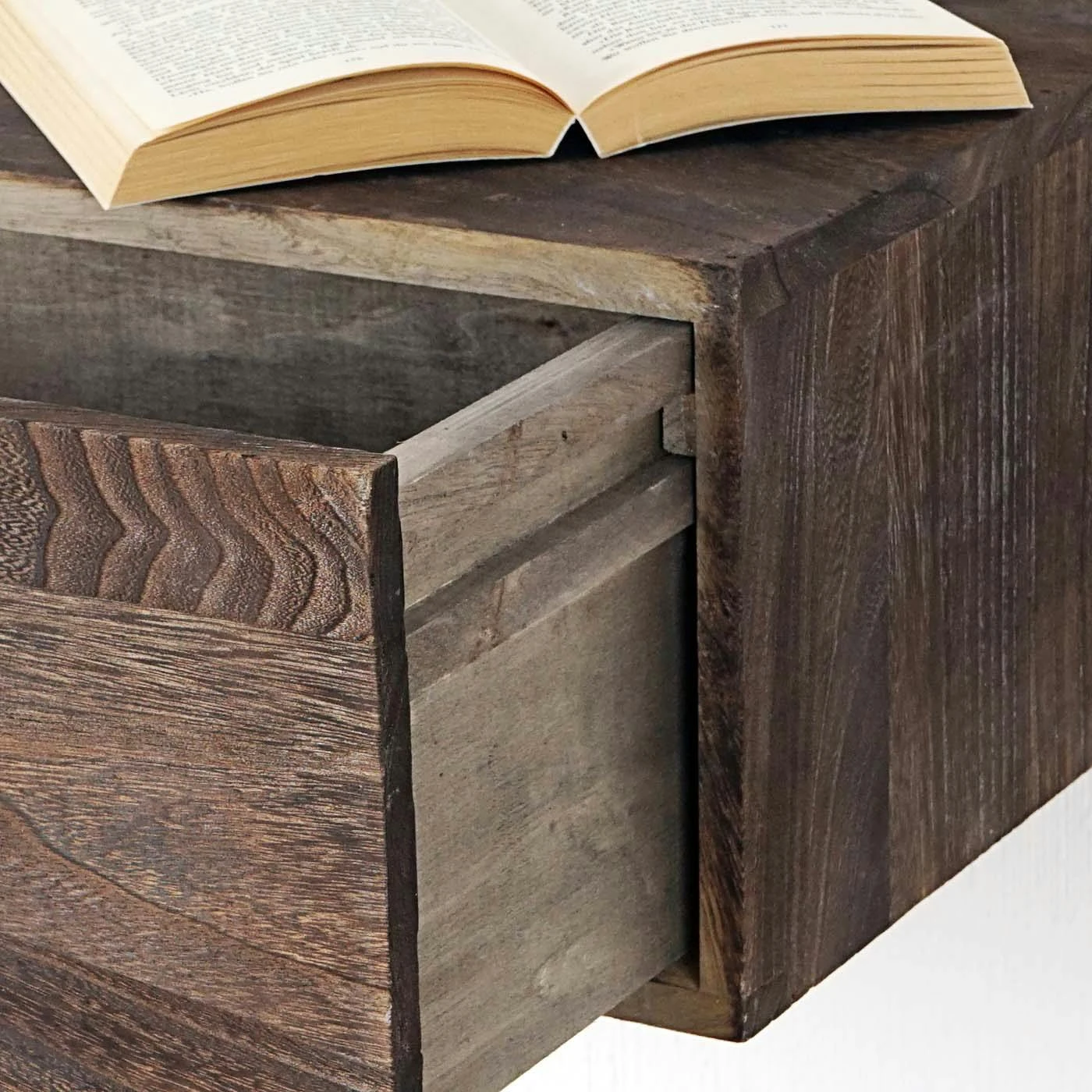Lassen Sie sich von der lädiert anmutenden Oberfläche nicht täuschen, die Produkte dieser Serie sind qualitativ hochwertig verarbeitet und wurden nur aus den besten Materialien gefertigt. Die Holzelemente wurden hauptsächlich aus der Paulownie hergestellt, einem auch schon in Europa kultivierten Wertholzbaum, der aufgrund seiner Leichtigkeit und hohen Stabilität auch als das Aluminium der Hölzer bezeichnet wird.